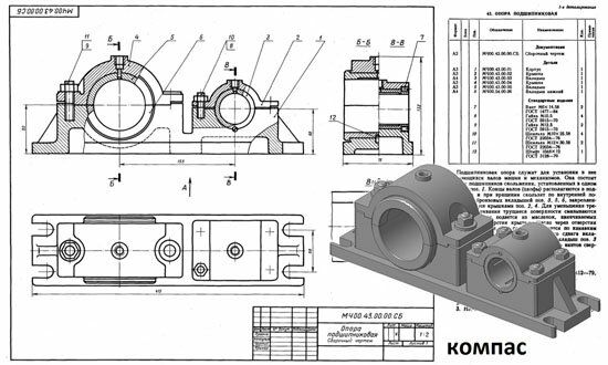 Подшипниковая опора служит для установки в нее вращающихся валов машин и механизмов. Она состоит из двух подшипников скольжения, установленных в одном корпусе поз. 1. Концы валов (цапфы) располагаются в подшипниках и при вращении скользят по внутренней поверхности бронзовых вкладышей поз. 3, 5, 6, закрепленных в корпусе крышками поз. 2, 4. Для уменьшения трения и изнашивания трущиеся поверхности смазываются маслом, которое подается из масленок, ввинчиваемых в резьбовые отверстия крышек. Масло через отверстия во вкладышах поз. 3 и поз. 5 растекается по канавкам вкладышей. Для предотвращения осевого сдвига вкладыши поз. 5 и поз. 6 имеют буртики, а вкладыш поз. 3 закрепляется винтами поз. 7. Отверстия для винтов сверлятся при сборке.