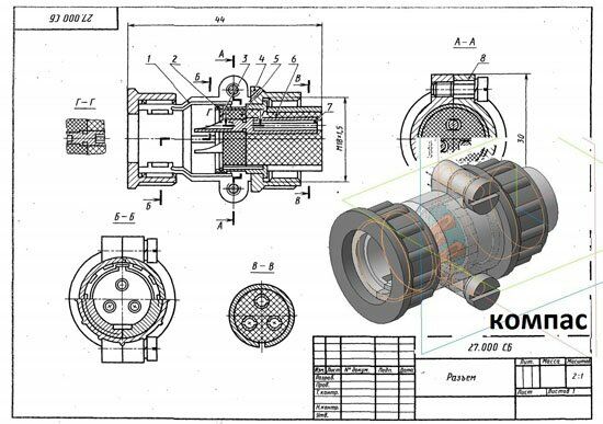 Разъем применяется в электро- и радиотехнике и является соединительным элементом электрических цепей. Кабельная розетка разъема состоит из трех контактов, заключенных в корпус и изолированных один от другого. При соединении вилки и розетки разъема контакты вилки входят в гнезда контактов розетки. Чтобы соединения контактов вилки и розетки соответствовали один другому (по номеру), на детали 2 предусмотрен направляющий паз. Контакты (деталь 7) имеют косой срез для удобства и прочности пайки проводов. Разъем 27.000 сборочный чертеж