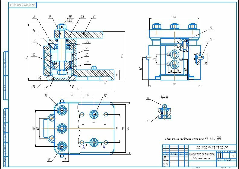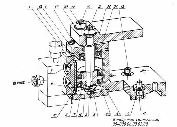 Кондуктор скальчатый предназначен для сверления отверстий в деталях на вертикальных и горизонтальных сверлильных стенках.На шток 9 надевается поршень 10 с предварительно установленными в него манжетами 22 и кольцами 7. Поршень крепится на штоке гайкой 19 и стопорной шайбой 8, которая своим выступом входит в паз штока, а отогнутый край ее предотвращает отвинчивание гайки 19. В корпус 1 вставляется гильза 6 вместе со штоком 9 и поршнем 10. Гильза 6 закрывается прокладками 16 и крышками 2, 5, 13, прикрепленными к корпусу 1 винтами 17. В крышку 13 вставляется манжета 21, а в крышку 2 - сальник 23, в отверстия ф20 корпуса 1 перемещаются скалки 14 и 15. Винты (не показаны) с контргайками (не показаны), входящие в пазы скалок, ограничивают их ход. Сверху на скалки 14 и 15 и шток 9 надевается кондукторная плита 3, которая крепится гайками 19 и шайбами 20. В отверстия 16 корпуса 1 вставляются втулки 4, пальцы 11 и 12. Они предназначены для установки базовой поверхности, служащей опорой для обрабатываемой детали.