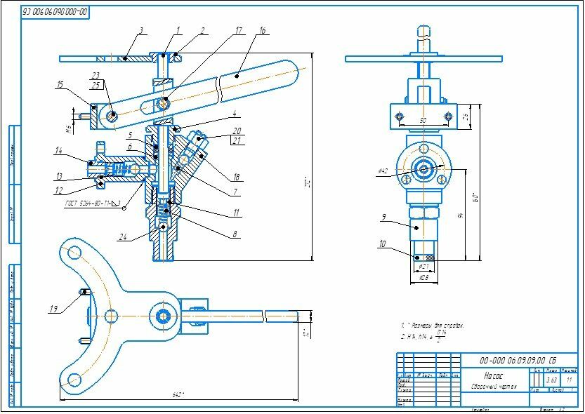Насос предназначен для создания рабочего давления в гидросистеме.В планку 3 запрессовывается втулка 2, которая служит направляющей для плунжера 1. В паз плунжера вставляется рукоятка 16 и закрепляется с помощью оси 23, втулки 17 и шплинта 25. В отверстие ф11 рукоятки 16 кронштейна 15 вставляется ось 23 со шплинтом 25. На плунжер 1 надевают втулку 4 и два кольца 5, между которыми помещают войлочное кольцо 22, и вставляют во втулку 6, запрессованную в корпус 18. Герметичность плунжера в корпусе обеспечивается сжатием кольца 22 при помощи втулки 4. На другой конец плунжера надевают втулку 2 в сборе с планкой 3. Насос имеет три клапана: всасывающий, нагнетательный и для выпуска воздуха системы. Всасывающий клапан в сборе вворачивается в отверстие Rc1/2 корпуса насоса 18. Нагнетательный клапан в сборе вставляют в отверстие ф16H12 корпуса насоса, после чего производят сварку кольцевым швом. Для подсоединения насоса к гидросистеме корпус нагнетательного клапана 12 имеет фланец с тремя отверстиями ф9. Герметизация соединения осуществляется при помощи направляющего штыря 14 и свинцовой прокладки 13 . Клапан для выпуска воздуха из системы состоит из шарика 24, пружины 7, винта 20 с гайкой 21. Насос крепится к резервуару с жидкостью при помощи планки 3 и кронштейна 15 болтами М12 и М16. При движении рукоятки 16 вверх, последняя тянет за собой плунжер 1, в результате под плунжером создается разрежение, открывается всасывающий клапан и полость под плунжером заполняется жидкостью. После заполнения рукоятка 16 идет вниз и под плунжером создается давление. Всасывающий клапан закрывается, а нагнетательный открывается и происходит наполнение гидросистемы. Все фаски для внутренней метрической резьбы выполнены по ГОСТ 10549-80 и на чертежах деталей не указаны.