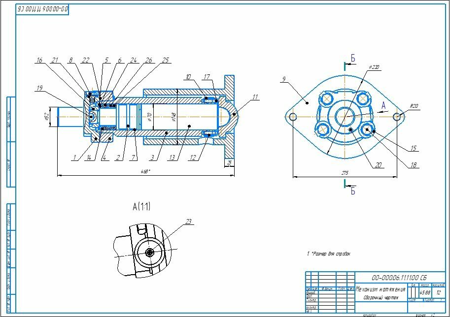 Собирается механизм в следующем порядке: цилиндр 3 запрессовывается во фланец 4 меньшим своим наружным диаметром ф85 и приваривается. Во фланец 4 с торца вставляется кольцо 22. К этому же торцу присоединяется фланец 1 и все скрепляется болтами 18 со стопорными шайбами 15. Во фланец 1 ввертывается масленка 23 и пробка 8 с уплотнительным кольцом 21. На поршень 2 насаживается два кольца 7, манжеты 26, кольца 14,24,25 прокладка 5 и шайба 6. Все эти детали поджимаются гайкой 16 которая навертывается на резьбовой конец поршня М36х1,5-6g и стопорится шплинтом 19.