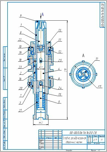 Головка резьбонарезная предназначена для нарезания внутренней резьбы раздвижными плашками.В корпусе 1 установлен сердечник 4, соединенный с крестовиной 8 винтами 19 и выключатель 2 с пружиной 16 и осью (штифтом) 23. Кольцо направляющее 6 надевается на корпус 1. Штифт 25 вставляется в отверстие ?6 кольца и пазы корпуса и сердечника. Со стороны крестовины на корпус надета втулка упорная 13 с установленными на ней подшипником (кольцо упорное 12, сепаратор 11, шарики 22), кольцом регулировочным 14 и втулкой регулировочной 10, скрепленной с кольцом направляющим 6 винтами 18. К корпусу 1 винтами 17 крепится крышка 9. Гайка регулировочная 7 вместе с кольцом резьбовым 3 и стопорным винтом 20 надевается на корпус. Штифт 24 вставляется в отверстие ф6 кольца 3, сердечника 4 и пазы корпуса 1. В отверстие ?25 корпуса вставляется втулка упорная 15, пружина 21, которая поджимается винтом 5, ввернутым в сердечник 4. В нерабочем состоянии плашки в фигурных пазах крестовины сдвинуты к оси. В этот момент выключатель 2 отсоединен от гайки 7. В рабочее положение головка приводится перемещением кольца 6 вдоль корпуса в сторону крестовины. Вместе с ним перемещается сердечник 4 с крестовиной 8 и гайка 7 с кольцом 3, раздвигая плашки до нужного размера резьбы. Выключатель 2 входит в зацепление с гайкой 7, препятствуя перемещению сердечника относительно корпуса. На длину обрабатываемой резьбы головка настраивается кольцом 3 и гайкой 7 так, что в конце обработки втулка 13 упирается в торец обрабатываемой детали, смещает кольцо 6, которое утапливает выключатель 2 и освобождает гайку 7. Под действием пружины 21 сердечник 4 и крестовина 8 перемещаются относительно корпуса, сдвигая плашки к оси.