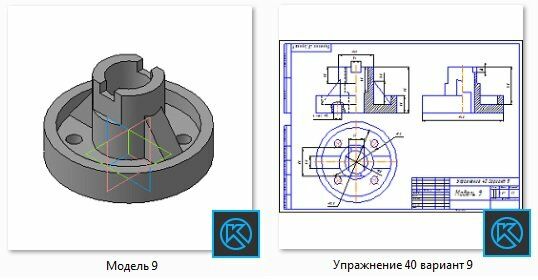 Упражнение 40 По двум видам модели построить третий. Выполнить необходимые разрезы. Поставить размеры.