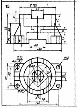 Упражнение 40 По двум видам модели построить третий. Выполнить необходимые разрезы. Поставить размеры.