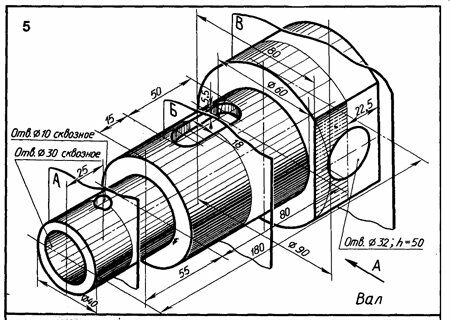 Упражнение 46 Начертить главный вид вала, взяв направление взгляда по стрелке А Выполнить три сечения. Сечение плоскостью А расположить на продолжении следа секущей плоскости, сечение плоскостью Б - на свободном месте чертежа, сечение плоскостью В - в проекционной связи.