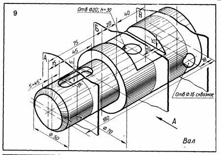 Начертить главный вид вала, взяв направление взгляда по стрелке А Выполнить три сечения. Сечение плоскостью А расположить на продолжении следа секущей плоскости, сечение плоскостью Б - на свободном месте чертежа, сечение плоскостью В - в проекционной связи.