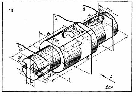 Начертить главный вид вала, взяв направление взгляда по стрелке А Выполнить три сечения. Сечение плоскостью А расположить на продолжении следа секущей плоскости, сечение плоскостью Б - на свободном месте чертежа, сечение плоскостью В - в проекционной связи.