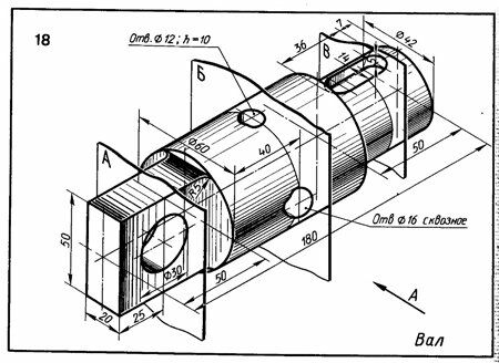 Начертить главный вид вала, взяв направление взгляда по стрелке А Выполнить три сечения. Сечение плоскостью А расположить на продолжении следа секущей плоскости, сечение плоскостью Б - на свободном месте чертежа, сечение плоскостью В - в проекционной связи.