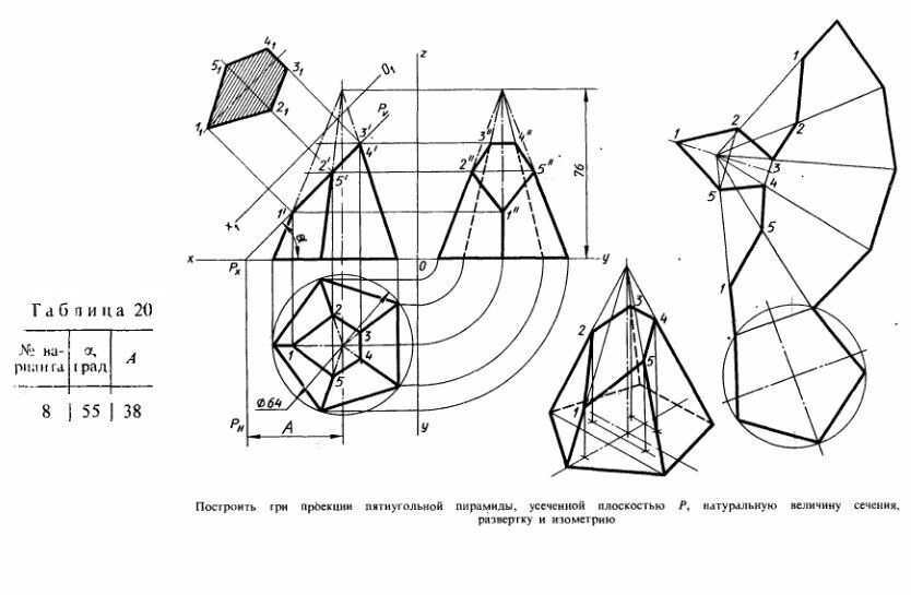 Графическая работа 5 часть 2 Построить три проекции пятиугольный пирамиды, усеченной плоскостью Р, натуральную величину сечения, развертку и изометрию.