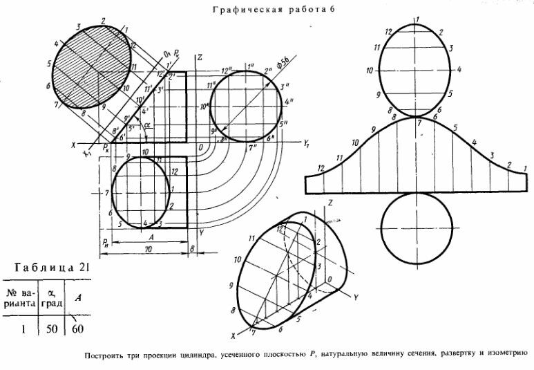 Графическая работа 6 Построить три проекции цилиндра, усеченного плоскостью Р, натуральную величину сечения, развертку и изометрию.