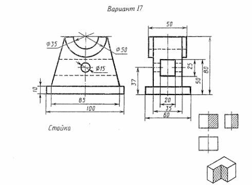По двум проекциям построить третью проекцию с применением разрезов, указанных в схеме, изометрическую проекцию учебной модели с вырезом передней четверти. Нанести размеры.