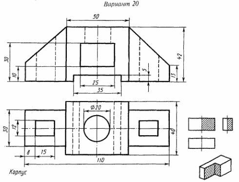 По двум проекциям построить третью проекцию с применением разрезов, указанных в схеме, изометрическую проекцию учебной модели с вырезом передней четверти. Нанести размеры.