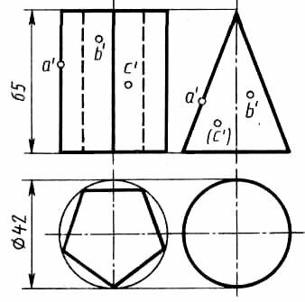 Согласно варианту определить геометрические тела, проекции которых следует построить. По заданным двум проекциям построить (в тонких линиях) третью (вид слева). На каждый чертеж геометрического тела нанести три точки А, В, С. Точка А принадлежит ребру или контурной образующей; точка В расположена на видимой части поверхности тела; точка С (в скобке) расположена на невидимой поверхности (при взгляде на фронтальную проекцию). По намеченным на поверхности геометрических тел проекциям точек найдите другие их проекции. Обозначение проекций точек, например, для точки А: а' – фронтальная проекция, а - горизонтальная проекция, а" – профильная проекция. Выполнить аксонометрические проекции данных геометрических тел.