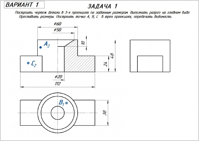 Для студентов ИГЭУ им. Ленина по предмету Инженерная и компьютерная графика (ИКГ)Построить чертеж детали в 3-х проекциях по заданным размерам. Выполнить разрез на главном виде. Проставить размеры. Построить точки A,B,C в трех проекПостроить чертеж детали в 3-х проекциях по заданным размерам. Выполнить разрез на главном виде. Проставить размеры. Построить точки A,B,C в трех проек