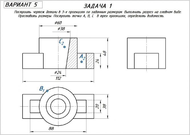 Для студентов ИГЭУ им. Ленина по предмету Инженерная и компьютерная графика (ИКГ)Построить чертеж детали в 3-х проекциях по заданным размерам. Выполнить разрез на главном виде. Проставить размеры. Построить точки A,B,C в трех проекПостроить чертеж детали в 3-х проекциях по заданным размерам. Выполнить разрез на главном виде. Проставить размеры. Построить точки A,B,C в трех проек