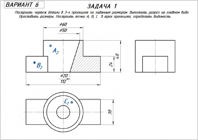 Для студентов ИГЭУ им. Ленина по предмету Инженерная и компьютерная графика (ИКГ)Построить чертеж детали в 3-х проекциях по заданным размерам. Выполнить разрез на главном виде. Проставить размеры. Построить точки A,B,C в трех проекПостроить чертеж детали в 3-х проекциях по заданным размерам. Выполнить разрез на главном виде. Проставить размеры. Построить точки A,B,C в трех проек