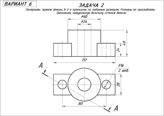 Главная » Учебные материалы » Инженерная и компьютерная графика (ИКГ) » Решения задач » ИГЭУ им. Ленина » 1 семестр » Номер 2 » Вариант 6 » Построить чертеж детали в 2-х проекциях по заданным размерам. Размеры не проставлять. Выполнить натуральную величину сечения детали.