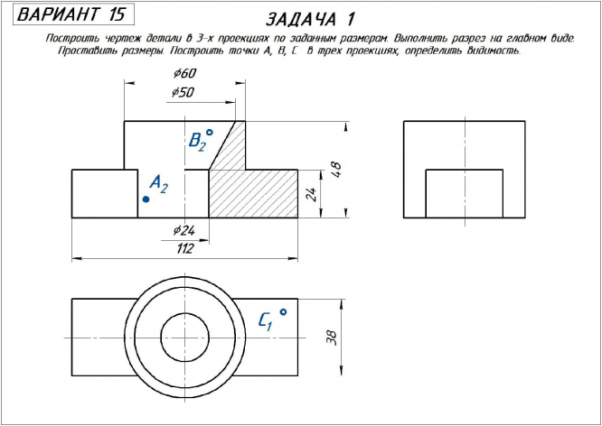 Для студентов ИГЭУ им. Ленина по предмету Инженерная и компьютерная графика (ИКГ)Построить чертеж детали в 3-х проекциях по заданным размерам. Выполнить разрез на главном виде. Проставить размеры. Построить точки A,B,C в трех проекПостроить чертеж детали в 3-х проекциях по заданным размерам. Выполнить разрез на главном виде. Проставить размеры. Построить точки A,B,C в трех проек