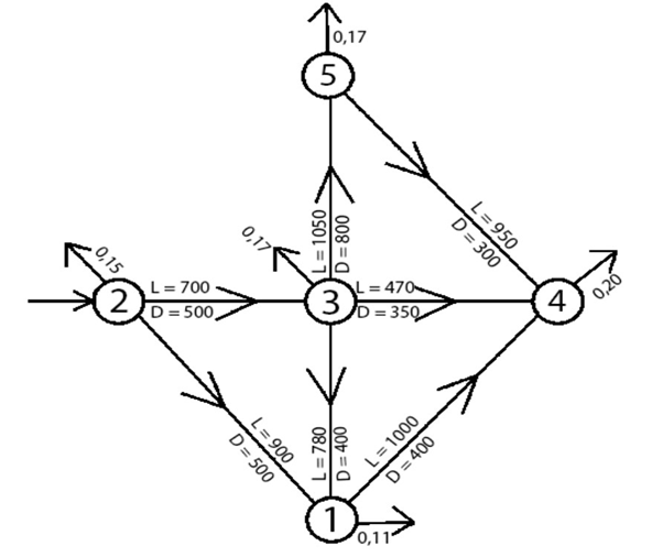 Этап 1: Согласно заданию выбрана схема сети и значения узловых отборов, длин и диаметров участков сети (рис. 1).