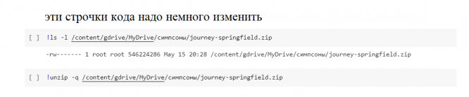 2. Изменить путь к архиву на свой (строка /content/gdrive/MyDrive/симпсоны/journey-springfield)