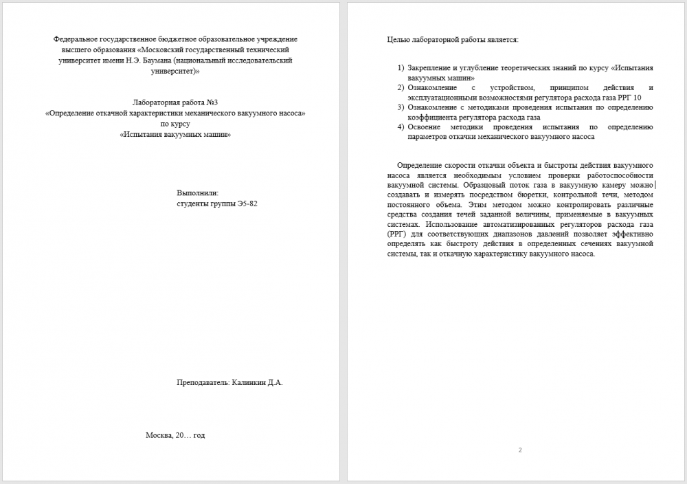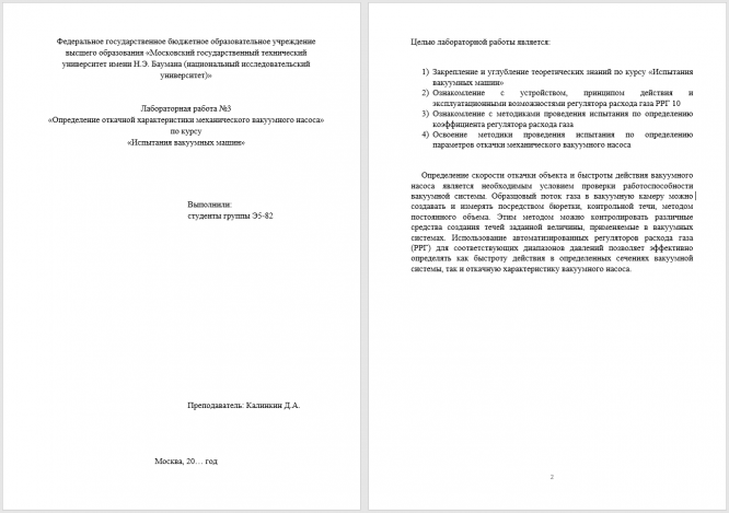 Для студентов МГТУ им. Н.Э.Баумана по предмету Испытания вакуумных машинОпределение откачной характеристики механического вакуумного насосаОпределение откачной характеристики механического вакуумного насоса