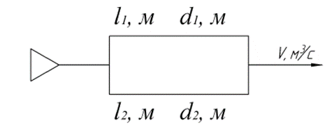 Головная часть водяной тепловой сети состоит из двух параллельно включенных (подающей и обратной) магистралей. Трубопроводы одной магистрали имеют внутренний диаметр d1, и длину l1, а другой – d2 и l2 соответственно. Схема подающих трубопроводов приведена на рисунке 3.