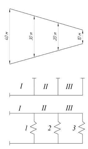 Схема водяной сети с тремя потребителями и график напоров для нее при нормальном режиме, когда расход воды у каждого потребителя составляет V'1= V'2= V'3=0,1 м3/с, приведены на рисунке 2. Рис. 2. Схема водяной сети с тремя п