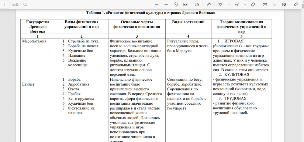 1) Таблица 1. «Развитие физической культуры в странах Древнего Востока»