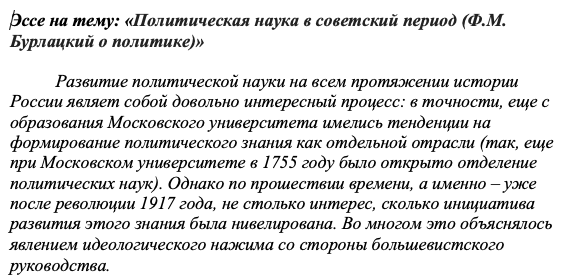 Для студентов МГУ им. Ломоносова по предмету История РоссииЭссе - Политическая наука в советский период (Ф.М. Бурлацкий о политике)Эссе - Политическая наука в советский период (Ф.М. Бурлацкий о политике)