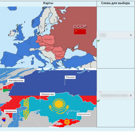 В таблице с помощью изображений условно представлены направления внешней политики современной России. Заполните таблицу, выбрав для соответствующего изображения направление внешней политики России из выпадающего списка.