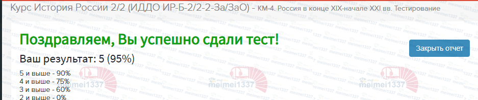 Для студентов ИДДО НИУ «МЭИ» по предмету История РоссииКМ-4. Россия в конце XIX-начале XXI вв. Тестирование - 95%КМ-4. Россия в конце XIX-начале XXI вв. Тестирование - 95%