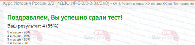 Для студентов ИДДО НИУ «МЭИ» по предмету История РоссииКМ-4. Россия в конце XIX-начале XXI вв. Тестирование - 85%КМ-4. Россия в конце XIX-начале XXI вв. Тестирование - 85%