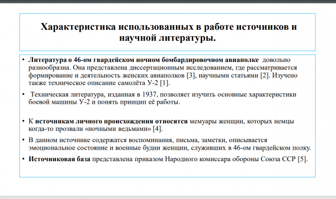 • Актуальность темы: Советские лётчицы – единственные женщины в мире, которые участвовали в воздушных боях во время Второй мировой войны. Героизм и мужество женщин, овладевание многими военными специальностями в короткие сроки, защита Отечества наравне с мужчинами - всё это обуславливает актуальность избранной темы исследования. Следует отметить, что за годы войны в СССР были сформированы 3 женских авиаполка [5]. 588- й полк, более известный как 46-й Таманский гвардейский ночной бомбардировочный авиационный полк (гнбап), лётчиц которого фашисты прозвали «ночными ведьмами», имеет особую историю. • Цель и задачи работы: В историографии изучены особенности формирования трёх женских авиационных полков в 1941г., методы проведения ночных боевых вылетов, также представлены биографии выдающихся лётчиц, удостоенных высокого звания Героя Советского Союза. Научная новизна данной работы в том, что делается попытка изучить достоинства и недостатки в ночном бою самолета У-2, стоящего на вооружении 588-го авиаполка, проследить за ведением боёв советских лётчиц, «ночных ведем», в историографическом ключе, с привлечением новых архивных источников. Поэтому целью данной работы является раскрытие вклада женщинавиаторов в победу над нацистской Германией в Великой Отечественной войне.