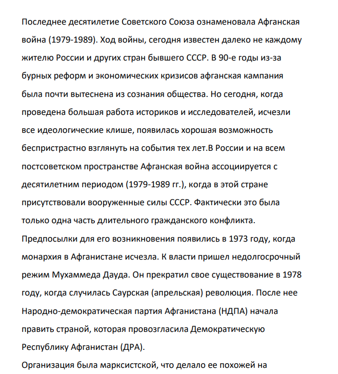 Последнее десятилетие Советского Союза ознаменовала Афганская война (1979-1989). Ход войны, сегодня известен далеко не каждому жителю России и других стран бывшего СССР. В 90-е годы из-за бурных реформ и экономических кризисов афганская кампания была почти вытеснена из сознания общества. Но сегодня, когда проведена большая работа историков и исследователей, исчезли все идеологические клише, появилась хорошая возможность беспристрастно взглянуть на события тех лет.В России и на всем постсоветском пространстве Афганская война ассоциируется с десятилетним периодом (1979-1989 гг.), когда в этой стране присутствовали вооруженные силы СССР. Фактически это была только одна часть длительного гражданского конфликта.