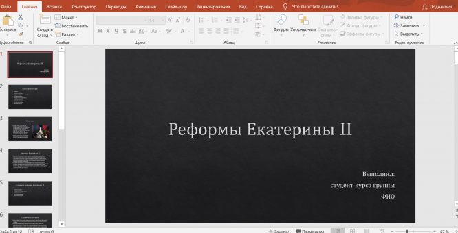 Презентация по истории на тему "Реформы Екатерины II". В работе подробно рассмотрены все основные реформы императрицы (губернская, дворянская, крестьянская и другие).
