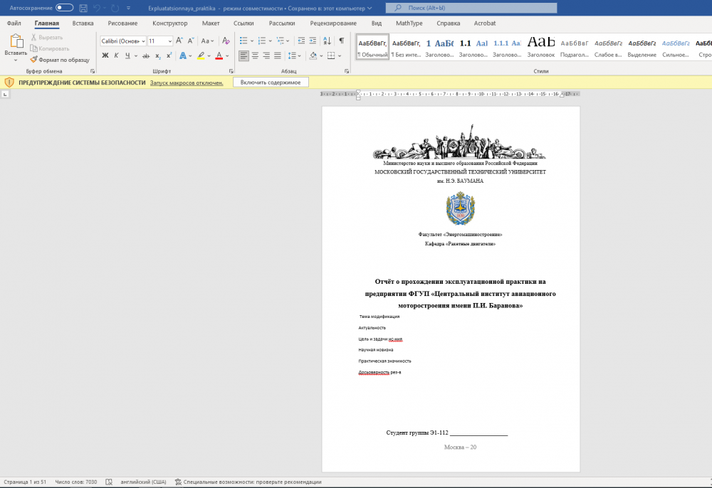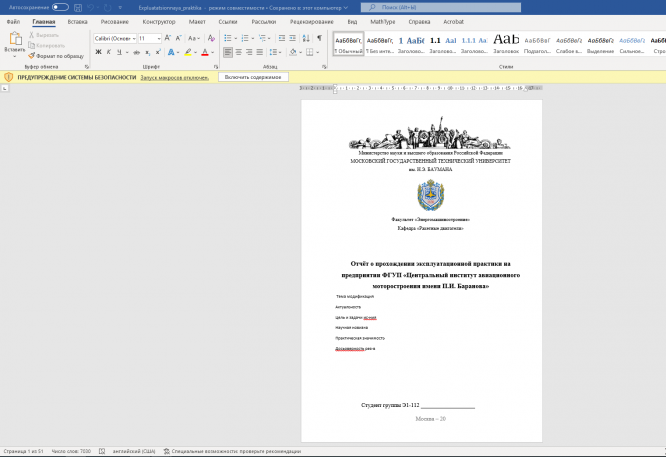 Отчёт по практике: На предприятии ФГУП "ЦИАМ имени П. И. Баранова" (эксплуатационная практика, преддипломная)