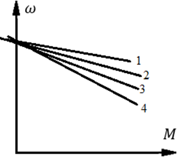 Расположите механические характеристики замкнутой системы электропривода постоянного тока в порядке увеличения коэффициента обратной связи по скорости.