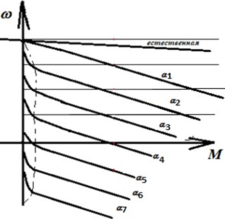 При работе от управляемого тиристорного преобразователя (ТП) механические характеристики электродвигателя постоянного тока независимого возбуждения имеют указанный на рисунке вид. Расположите характеристики в порядке уменьшения угла открытия тиристоров a.