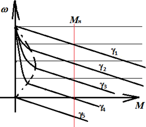 Приведите значения скважности импульсов транзисторного ключа g в порядке увеличения, если при работе от широтно-импульсного преобразователя (ШИП) механические характеристики электродвигателя постоянного тока независимого возбуждения имеют вид, представленный на рисунке.