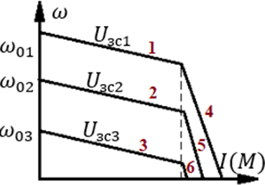Участки механических характеристик замкнутой системы электропривода с двигателем постоянного тока, где действует только отрицательная обратная связь по скорости, обозначены цифрами