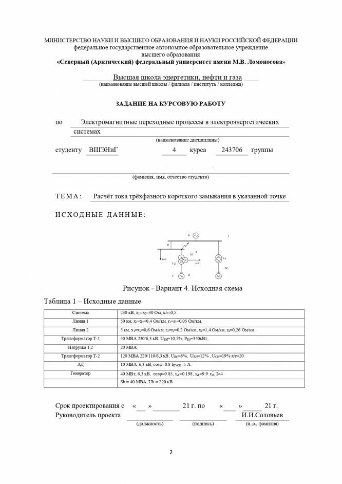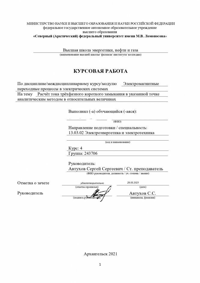 Для студентов САФУ им. Ломоносова по предмету Электромагнитные переходные процессы в электрических системахРасчёт тока трёхфазного короткого замыкания в указанной точке аналитическим методом в относительных величинахРасчёт тока трёхфазного короткого замыкания в указанной точке аналитическим методом в относительных величинах