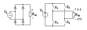 Для построения схемы инвертора напряжения воспользуемся принципом дуальности. Инвертор является устройством, противоположным выпрямителю, т.к. он преобразует напряжение постоянного тока в разнополярное напряжение прямоугольной или синусоидальной формы. Поменяем местами источник с нагрузкой в схеме выпрямителя и получим схему инвертора напряжения: