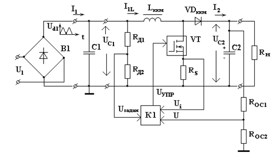Корректор коэффициента мощности (ККМ) или буст – конвертор предназначен для активной фильтрации тока сети. ККМ приближает фазовый сдвиг между током и напряжением источника к нулю и формирует синусоидальную форму тока, потребляемого от сети. ККМ является промежуточным звеном в схеме импульсного источника питания, включенным между выходом входного выпрямителя и входом конвертора напряжения. Он относится к повышающим импульсным стабилизаторам напряжения, т.к. напряжение на