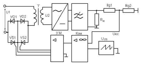 На рисунке изображена принципиальная схема тиристорного стабилизатора напряжения в цепи переменного тока при использовании пары встречно- параллельных тиристоров в первичной цепи трансформатора.