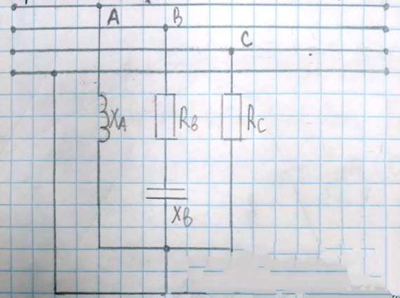 В трехфазную четырех проводную сеть включили звездой несимметричную нагрузку: в фазу А – индуктивный элемент с индуктивностью LA, в фазу В – резистор с сопротивлением RB, и емкостный элемент с емкостью СВ, в фазу С – резистор с сопротивлением RС. Лин