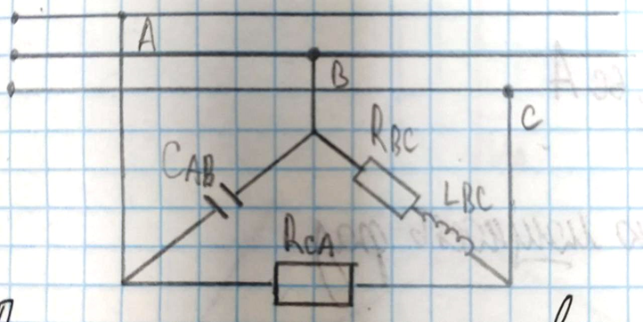 В трехфазную сеть включили треугольником несимметричную нагрузку. В фазу АВ – емкостный элемент СAВ, в фазу ВС – индуктивный элемент с ак-тивным сопротивлением RВС и индуктивностью LBC, в фазу С – резистор с сопротив-лением RСА. Линейное напряжением