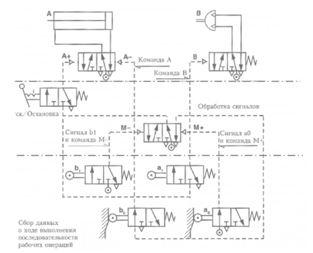 Где на пневмосхеме изображается пневматический цилиндр, выполняющий первый ход?