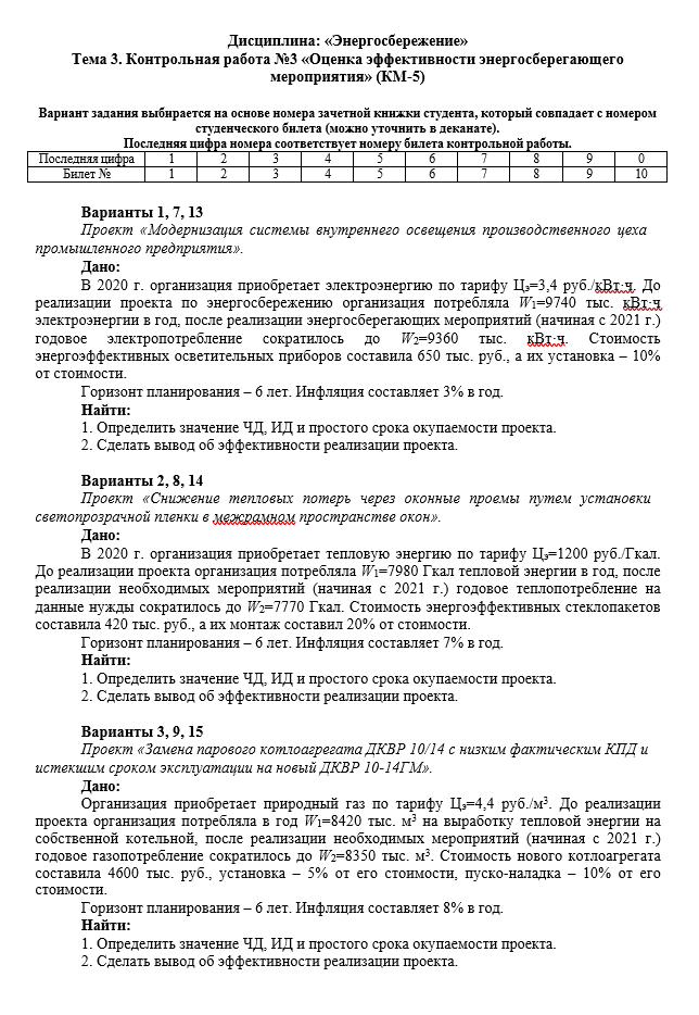 ДЗ КМ-5: КМ-5. Оценка эффективности энергосберегающего мероприятия. Контрольная работа. Вариант 2 вариант 2