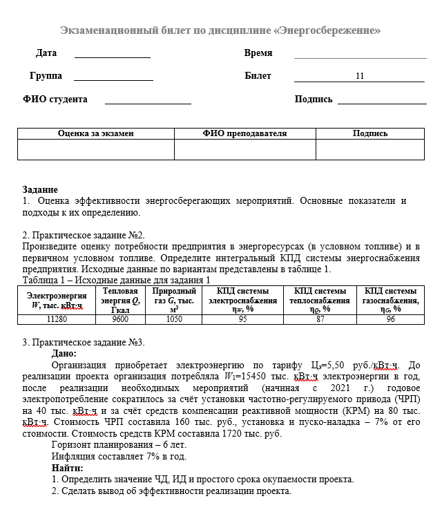 Произведите оценку потребности предприятия в энергоресурсах (в условном топливе) и в первичном условном топливе. Определите интегральный КПД системы энергоснабжения предприятия. Исходные данные по вариантам представлены в таблице 1.