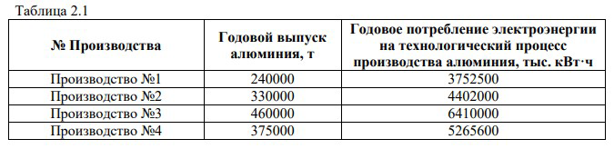 2.1) Определите энергоемкость производства алюминия (тыс. кВт·ч/т) для каждого из производств(№№1-4) в соответствии с данными из таблицы 2.1. Какое из представленных производств является наименее и наиболее энергоемким?